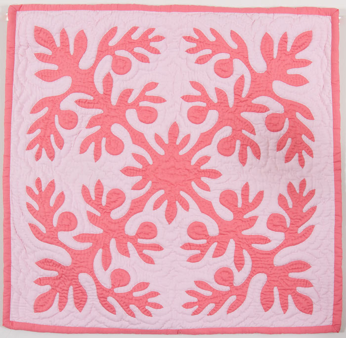アップリケもキルティングも手縫いで仕上げた本物のハワイアンキルト。