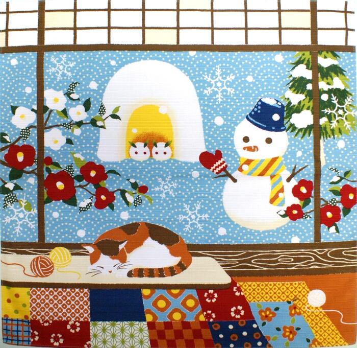 商品名:【 風呂敷 】さとうひろみ 冬景色 12月 1月 2月 猫 ねこ ネコ こたつ 雪だるま タペストリー 壁掛け